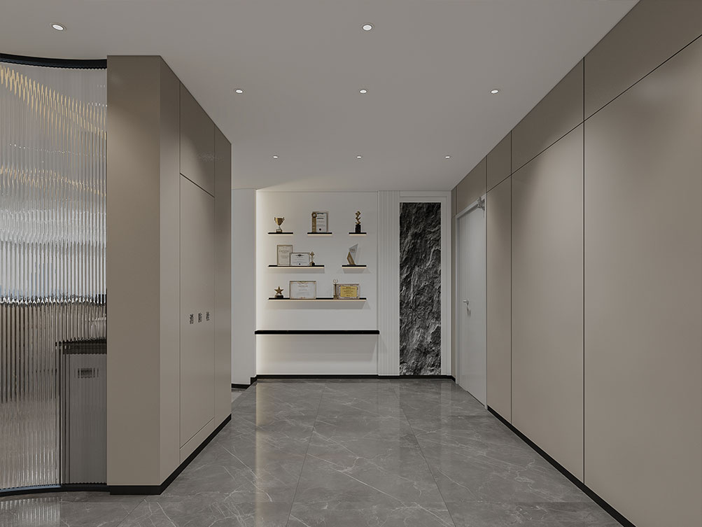風(fēng)順集團(tuán)裝修效果以 “大氣沉穩(wěn) + 現(xiàn)代高效” 為核心,整體采用深灰、米白為主色調(diào)搭配金屬線條點(diǎn)綴,凸顯企業(yè)質(zhì)感。前臺(tái)接待區(qū)用大理石背景墻嵌入集團(tuán) LOGO,搭配簡(jiǎn)約大氣的接待臺(tái)與藝術(shù)擺件,營(yíng)造專業(yè)第一印象;濟(jì)南辦公室裝修為開(kāi)放辦公區(qū)采用模塊化工位設(shè)計(jì),配備獨(dú)立收納與人體工學(xué)座椅,墻面穿插集團(tuán)發(fā)展歷程掛畫(huà)與綠植,兼顧高效與舒適;會(huì)議室按規(guī)模配置高清會(huì)議系統(tǒng)與吸音材質(zhì),滿足不同商務(wù)需求;同時(shí)預(yù)留休閑茶水區(qū)與榮譽(yù)展示墻,既方便員工放松,也直觀傳遞企業(yè)實(shí)力,整體空間兼具品牌形象與實(shí)用功能。